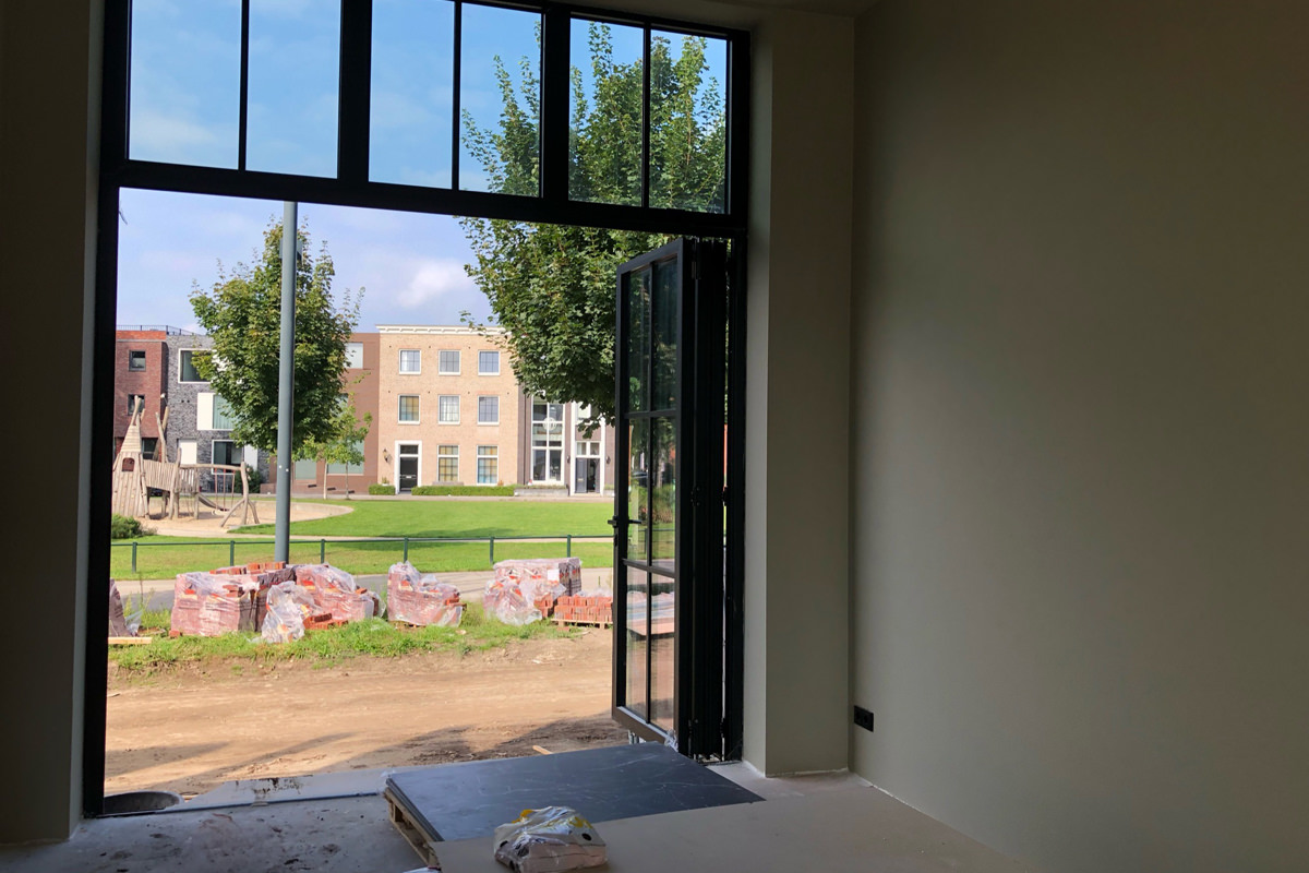 In de achtergevel hebben we het principe van industriële puien tussen de ruwe elementen doorgezet. Door dit principe te spiegelen t.o.v. de voorgevel krijgen we een verrassende en levendige achtergevel. Met de hoge dakopstanden van de woning is de woning tevens geschikt voor een toekomstig dakterras.